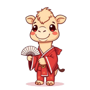 Decorate your space with a smile using this funny poster of a camel in a red kimono, holding a fan. Adds a touch of exotic humor.